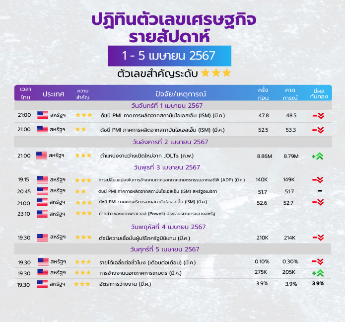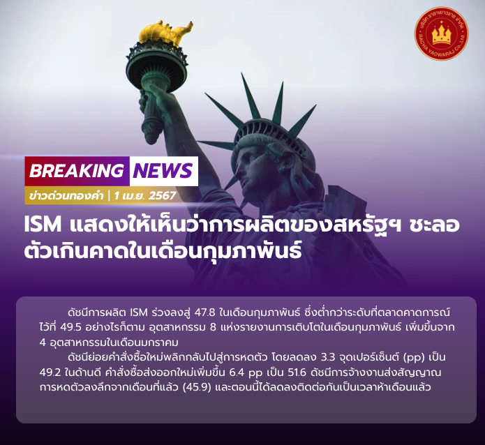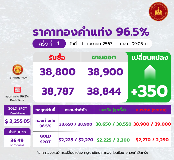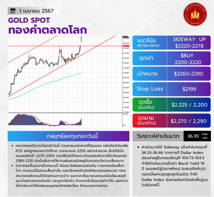 Nราคาสมาคมค้าทองคำไทยเมื่อวันที่ 30/03/2567 ณ เวลา 09.13 น.(ครั้งที่ 1 ) ขายออก 38550 รับซื้อ 38450 ราคาทองสมาคม Update +600 บาท ราคาทองคำไทยยังคงทำ All Time Tigh จากการที่ทองคำ Spot ได้ทะลุแนวต้านที่ แต่จากแรงซื้อที่มากเกินไปทั้งระยะสั้น กลาง ยาว ทำให้มีโอกาสพักฐานทางเทคนิคที่แนวรับ 2250-2240 ได้ ค่าเงินบาทยังไม่ผ่าน 36.46 และ Sideway ในกรอบ 36.33-36.46 จากการที่ Dollar Index สามารถรักษาแนวรับสำคัญที่ 104.3 ได้และอยู่ในกรอบ 104.49-104.3 ทำให้ทองไทยได้รับปัจจัยบวกและลบพร้อมกัน คาดการณ์ราคาสมาคมเปิด +50 บาท วันนี้ปล่อยออกมาดีในฝั่งซื้อ ทองไทยยังคงทำ All Time High และพักฐานตาม Spot โดยทองไทยยังคงรักษาฐานในกรอบ 38640 – 38400 ได้ ทำให้ทองไทยยังคงสามารถรักษาฐานขาขึ้นเอาไว้ได้ แต่วันนี้ต้องระวังการปรับฐานจากการที่ระยะกลาง / ยาวของทองไทยยังคงมีแรงซื้อมากเกินไป + การที่ Spot มีแนวโน้ม Test แนวรับที่ 2220-2210 อีกครั้งจากการที่ Dollar Index ยังมีแนวโน้มแข็งค่าในกรอบ 104.73-104.85 ในสัปดาห์นี้จากปัจจัยดัชนี PMI / การจ้างงานที่กดดันทอง (วัน พฤ กับ ศุกร์ ทองมีโอกาสเทส 2240-2250 อีกครั้งจากการที่ TF Day ของ Spot ยังเป็นขาขึ้นแข็งแกร่งดันทองไทยขึ้นตาม) กลยุทธทองไทยคือ ขึ้นขาย ลงซื้อ หากทองไทยมีการย่อตัวมากรอบแนวรับที่ 38650-38550 ให้ย่อซื้อ(หากหลุดให้ Cut Loss) เพื่อขายกรอบแนวต้านที่ 38900-39000.